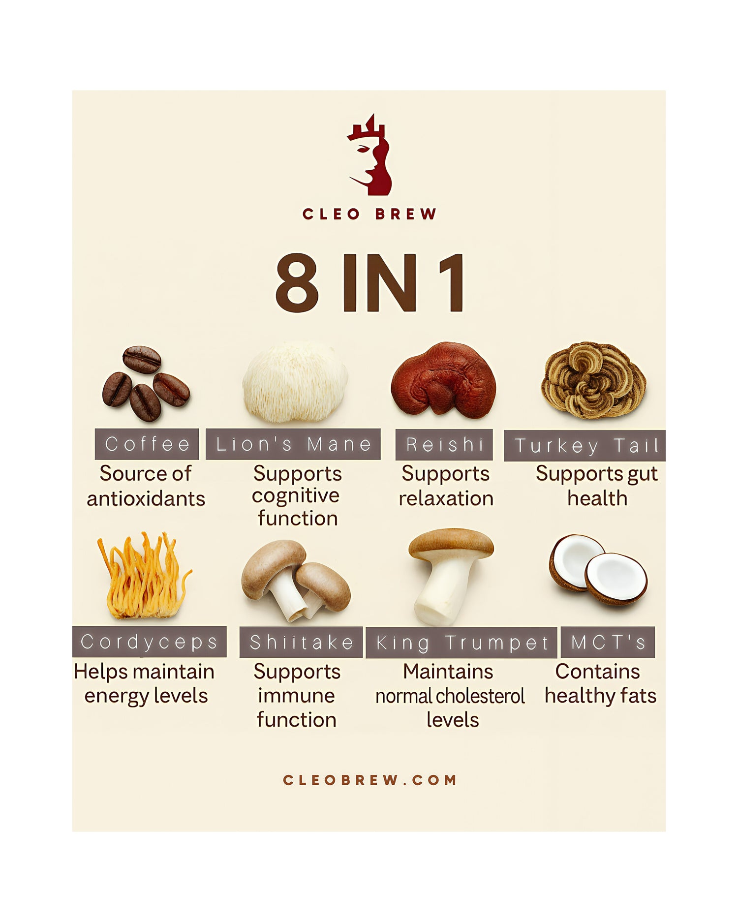 Cleo Brew mushroom coffee was born from a simple idea: that coffee should do more than just wake you up. We created this blend for people who move through life with intention — those who care about what they put in their body and how they feel each day. Every cup is a reflection of that purpose: a daily ritual that supports clarity, calm energy, and balance. This isn’t just coffee — it’s a moment to align with your best self.